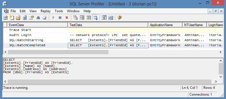 highlighted the peace of code. Now let me ON the SQL Server Profiler to see